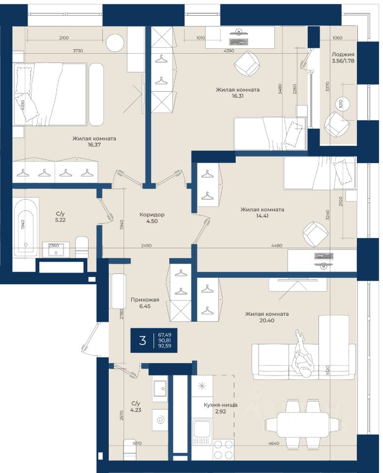 Жилой комплекс "NOVA" Квартира 137 общей площадью 92,59 м2 на 16 этаже.