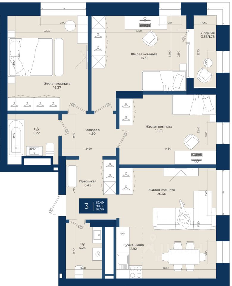 Жилой комплекс "NOVA" Квартира 144 общей площадью 92,59 м2 на 17 этаже.