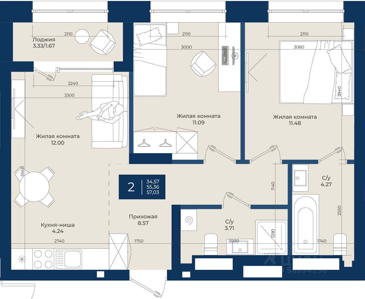 Жилой комплекс "NOVA" Квартира 161 общей площадью 57,03 м2 на 2 этаже.
