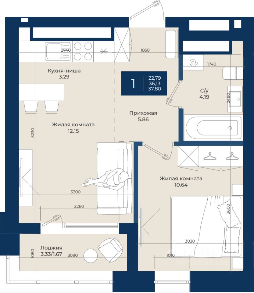Жилой комплекс "NOVA" Квартира 204 общей площадью 37,8 м2 на 6 этаже.