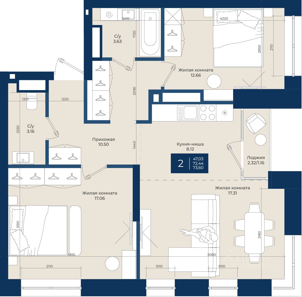 Жилой комплекс "NOVA" Квартира 203 общей площадью 73,6 м2 на 6 этаже.