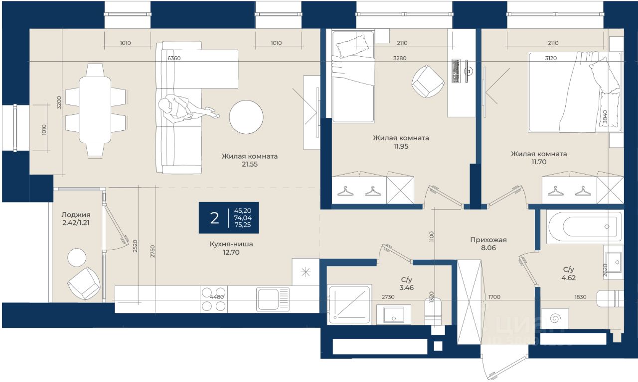Жилой комплекс "NOVA" Квартира 199 общей площадью 75,25 м2 на 6 этаже.