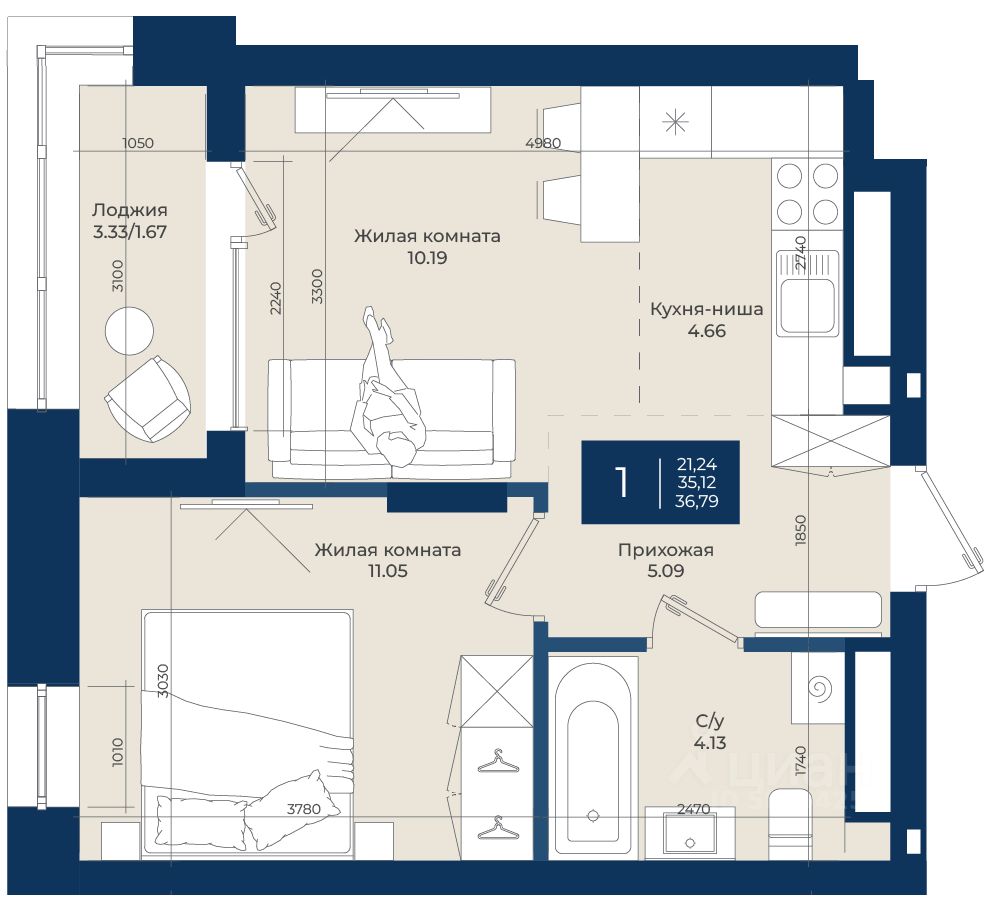 Жилой комплекс "NOVA" Квартира 208 общей площадью 36,79 м2 на 7 этаже.