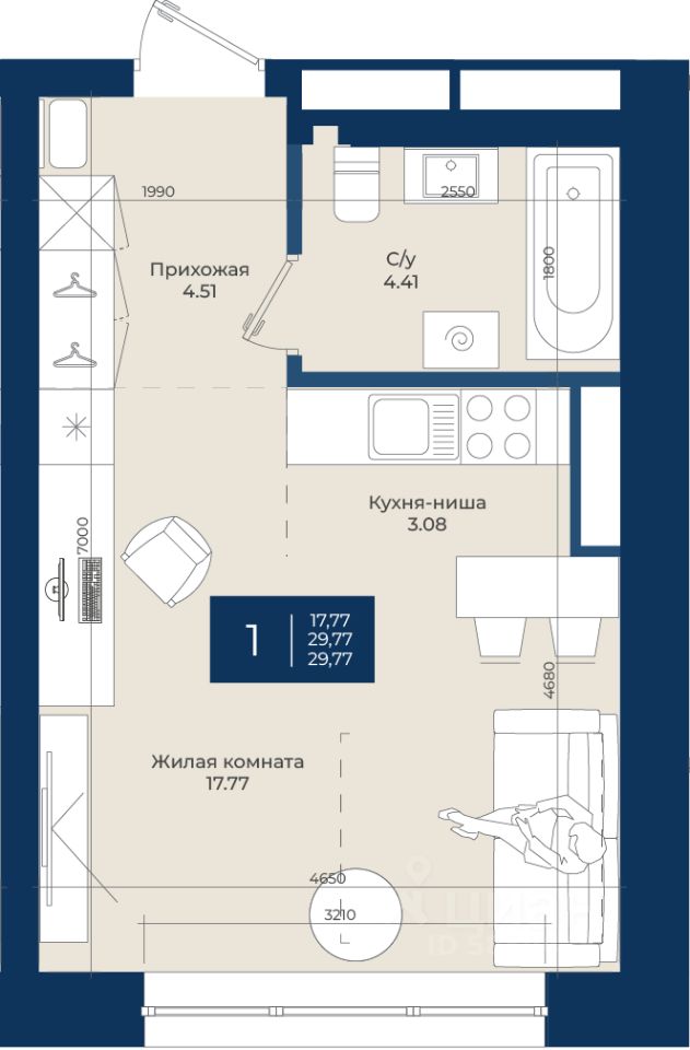 Жилой комплекс "NOVA" Квартира 215 общей площадью 29,77 м2 на 8 этаже.