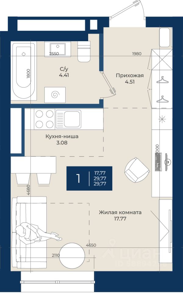 Жилой комплекс "NOVA" Квартира 226 общей площадью 29,77 м2 на 9 этаже.