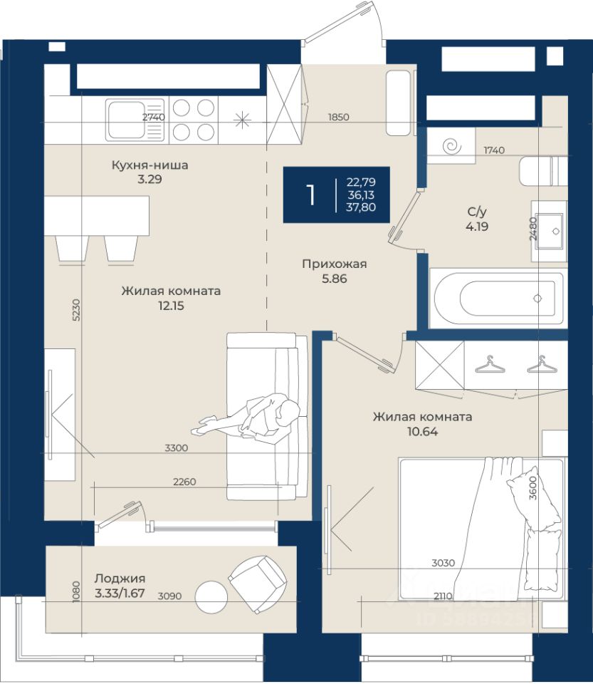 Жилой комплекс "NOVA" Квартира 234 общей площадью 37,8 м2 на 9 этаже.