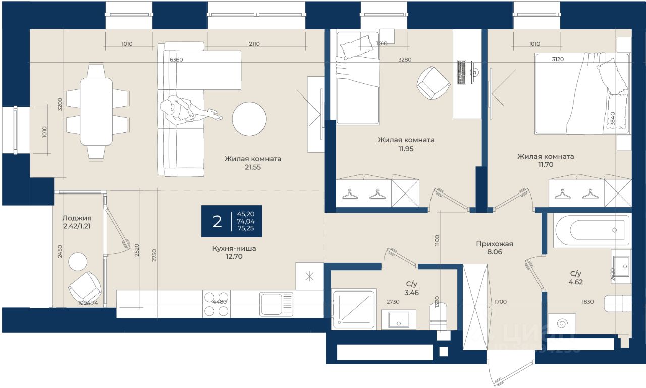 Жилой комплекс "NOVA" Квартира 229 общей площадью 75,25 м2 на 9 этаже.
