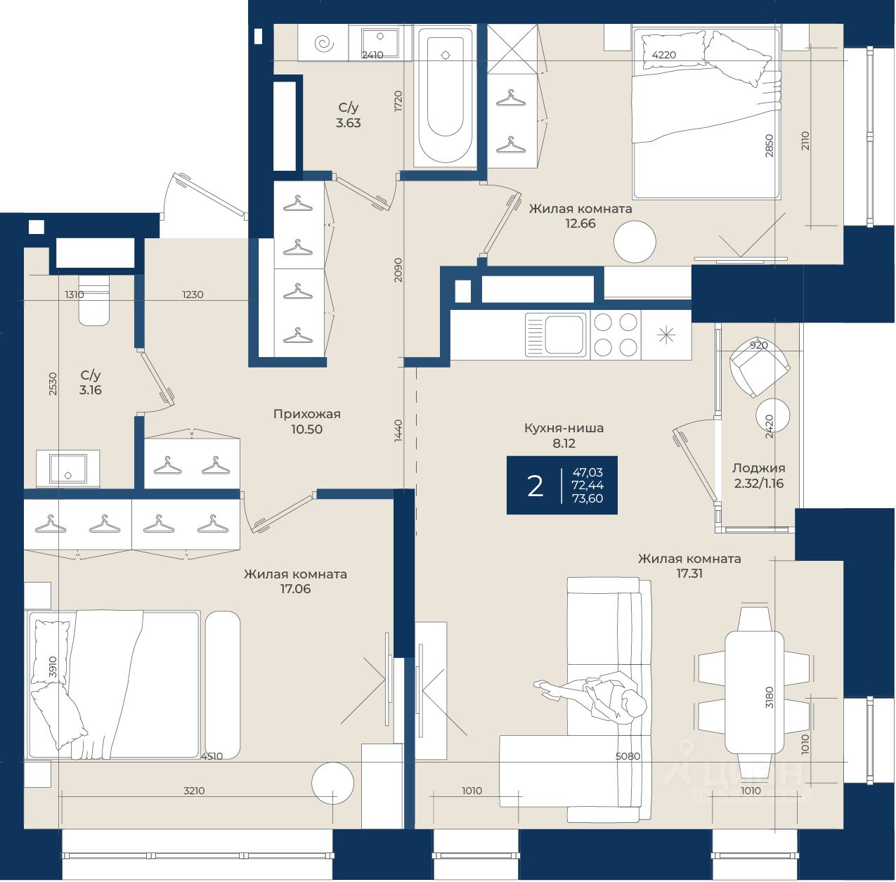 Жилой комплекс "NOVA" Квартира 243 общей площадью 73,6 м2 на 10 этаже.