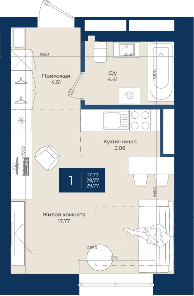 Жилой комплекс "NOVA" Квартира 245 общей площадью 29,77 м2 на 11 этаже.