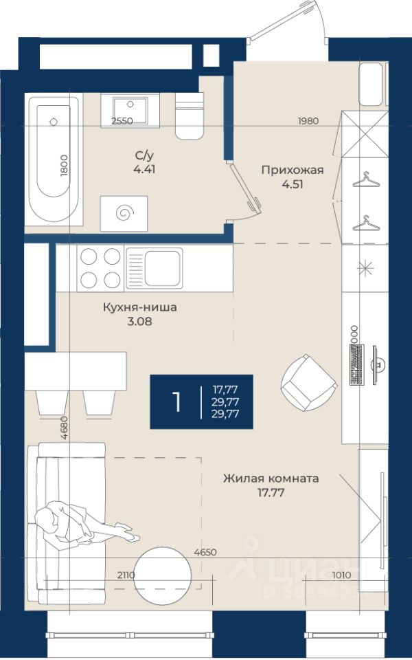 Жилой комплекс "NOVA" Квартира 246 общей площадью 29,77 м2 на 11 этаже.