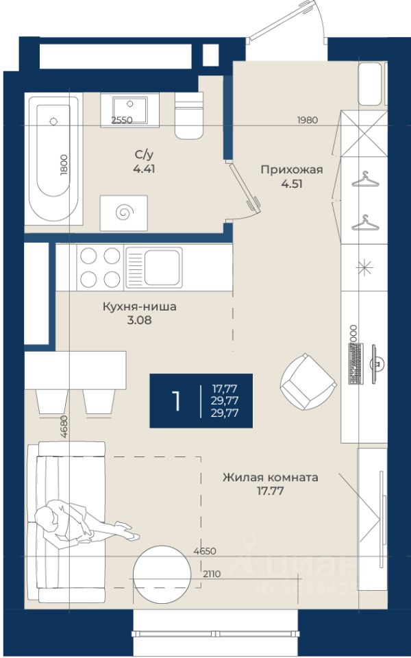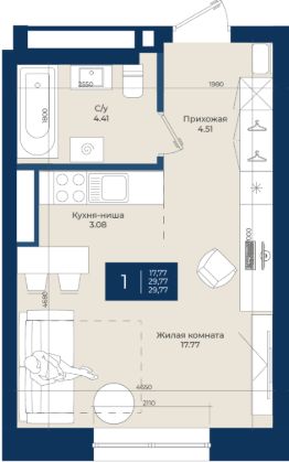 Жилой комплекс "NOVA" Квартира 256 общей площадью 29,77 м2 на 12 этаже.