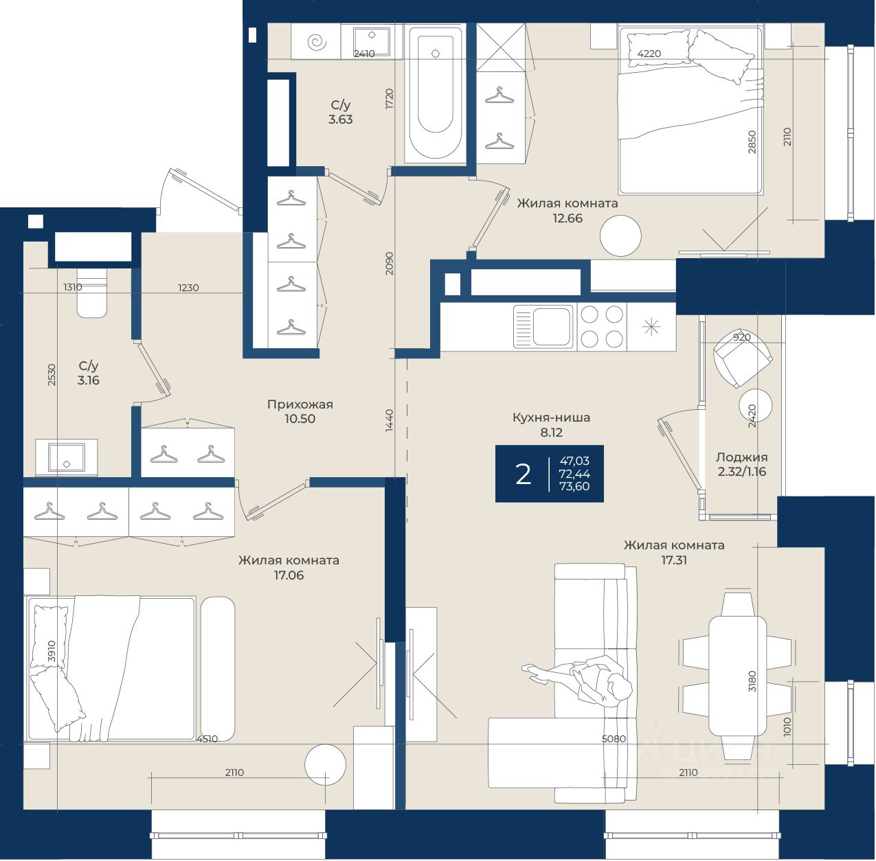 Жилой комплекс "NOVA" Квартира 263 общей площадью 73,6 м2 на 12 этаже.
