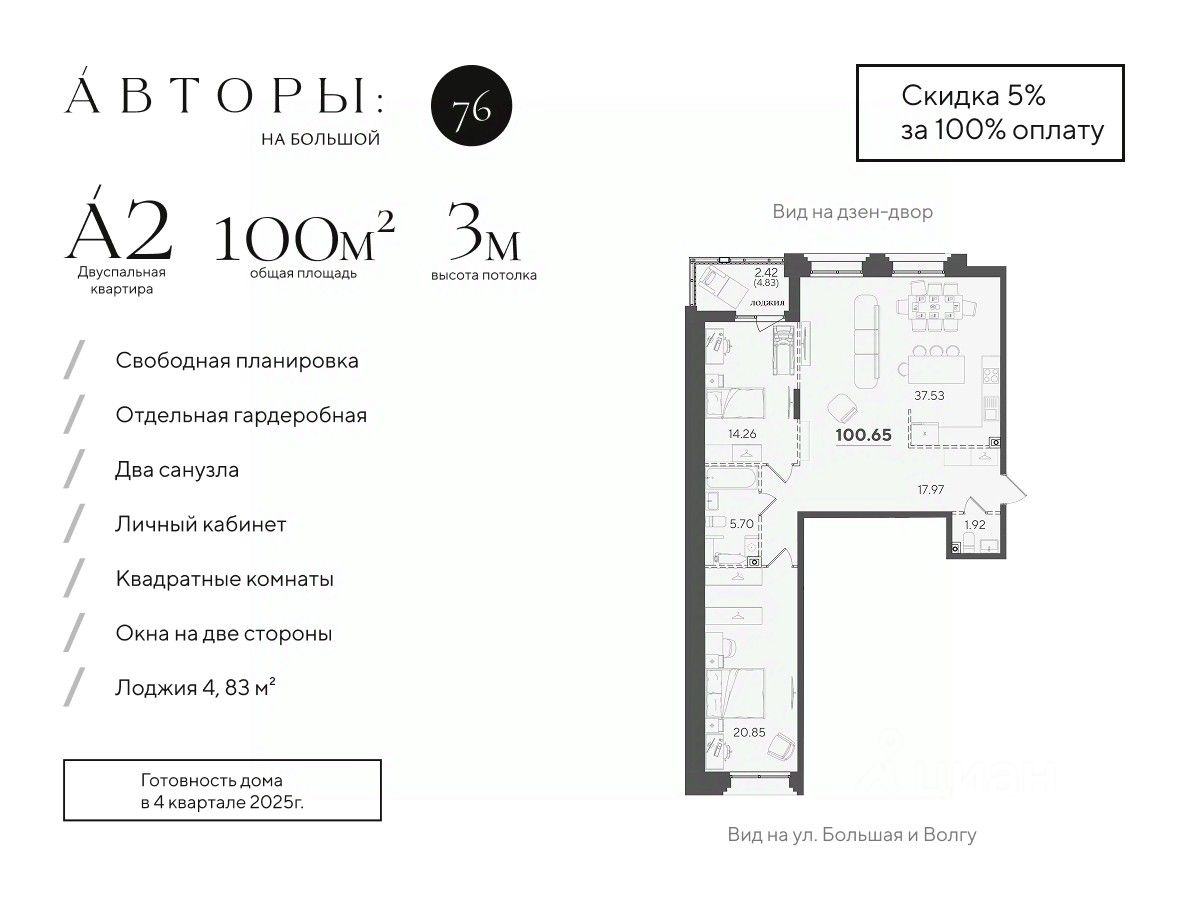 Продается 2-к квартира 5 в клубном доме "Авторы на Большой 76". Квартира с двумя спальнями на 2 этаже площадью 100.65 м², кухней-гостинной площадью 37.53 м², высотой потолков 3 м и двумя санузлами. Окна выходят на две стороны и открывают вид на Волгу и дзен-двор с обильным озеленением. Квартира сдается в свободной планировке, предоставляя полную свободу для ваших предпочтений в дизайне и возможность подстроить пространство под ваши жизненные ценности.