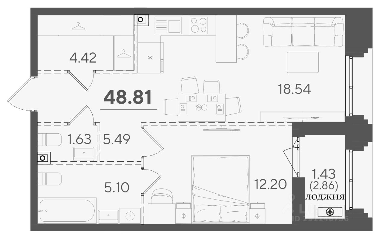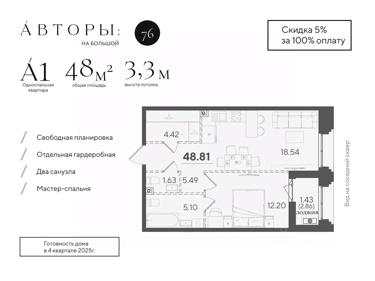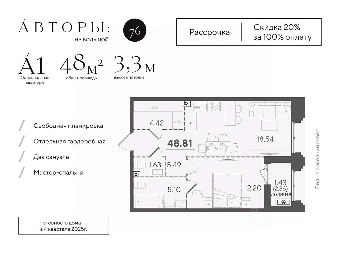 Продается видовая 1-к квартира 17 в клубном доме "Авторы на Большой 76". Квартира с одной спальней на 5 этаже площадью 48.8 м², кухней-гостинной площадью 18.54 м², высотой потолков 3.3 м и двумя санузлами. Окна открывают вид на соседний сквер. Квартира сдается в свободной планировке, предоставляя полную свободу для ваших предпочтений в дизайне и возможность подстроить пространство под ваши жизненные ценности.