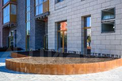 Дзен-двор разработан в концепции "городской гостиной", оснащенной барной сткойкой для уютных встреч и коворкингом для комфортной работы на открытом воздухе. Детская зона вдохновлена тематикой реки и её естественной средой. Площадь двора составляет 1100 м², на которых расположатся более 15 видов декоративных растений и цветников.