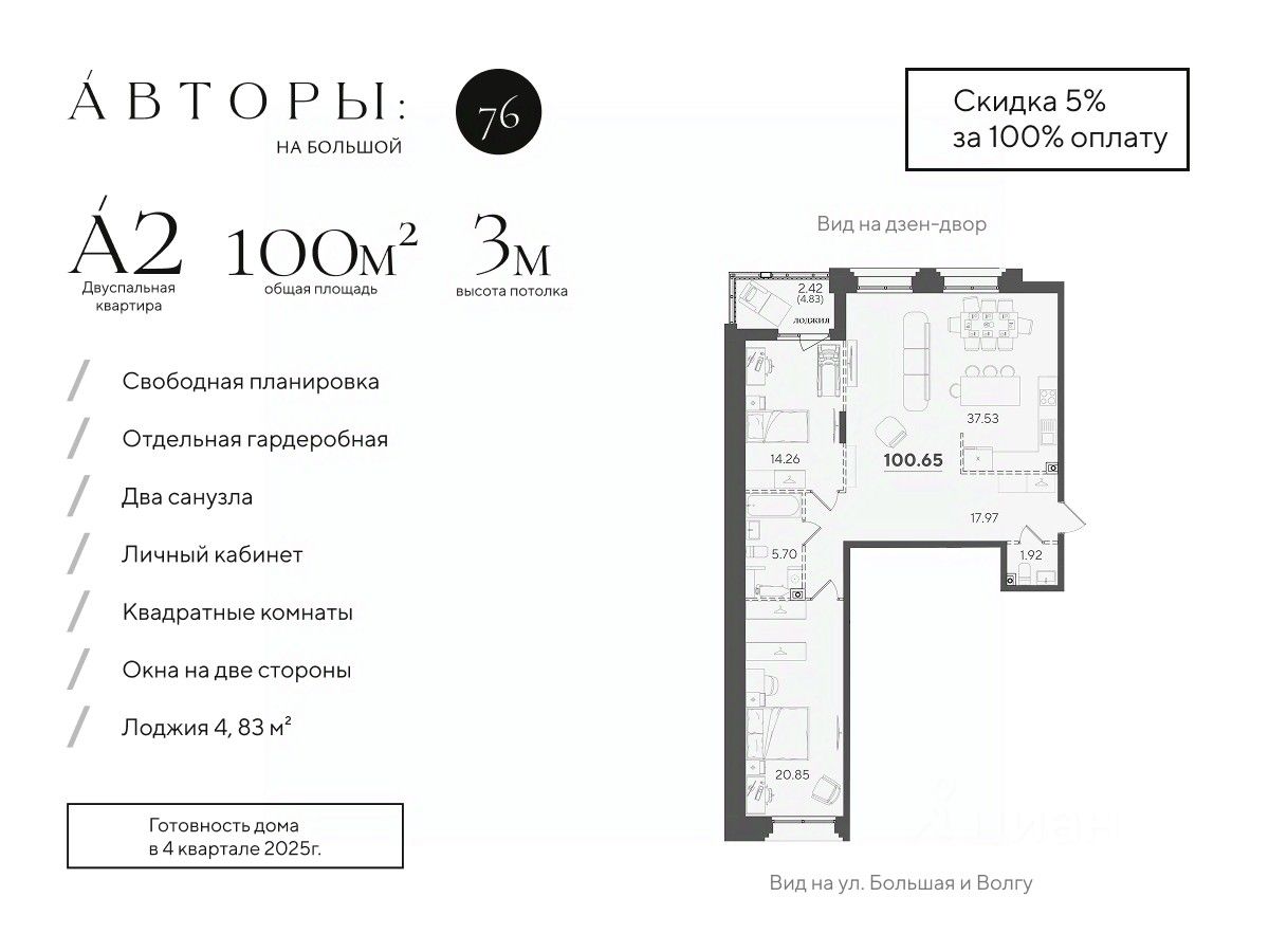 Продается видовая 2-к квартира 20 в клубном доме "Авторы на Большой 76". Квартира с двумя спальнями на 5 этаже площадью 100.65 м², кухней-гостинной площадью 37.53 м², высотой потолков 3.3 м и двумя санузлами. Окна выходят на две стороны и открывают вид на Волгу и дзен-двор с обильным озеленением. Квартира сдается в свободной планировке, предоставляя полную свободу для ваших предпочтений в дизайне и возможность подстроить пространство под ваши жизненные ценности.
