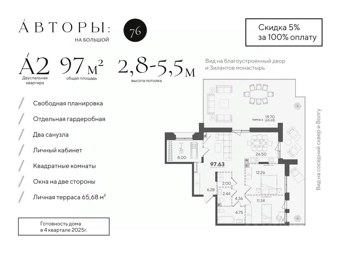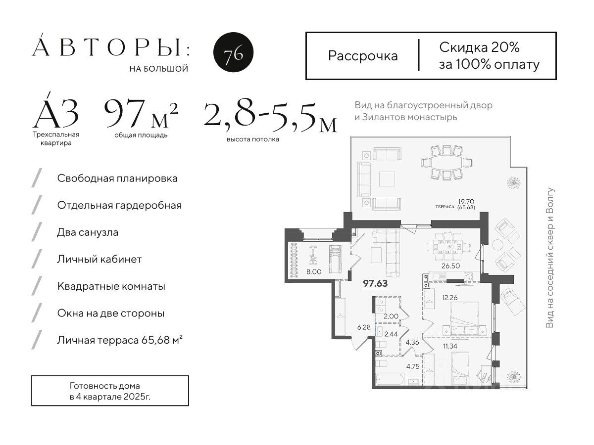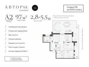 Продается 3-к квартира 21 в клубном доме "Авторы на Большой 76". Видовая квартира с терассой и двумя спальнями на 6 этаже площадью 97.63 м², кухней-гостинной площадью 26.5 м², высотой потолков от 2,8 до 4,5 м и двумя санузлами. Окна выходят на две стороны и открывают вид на дзен-двор с обильным озеленением. Квартира сдается в свободной планировке, предоставляя полную свободу для ваших предпочтений в дизайне и возможность подстроить пространство под ваши жизненные ценности.