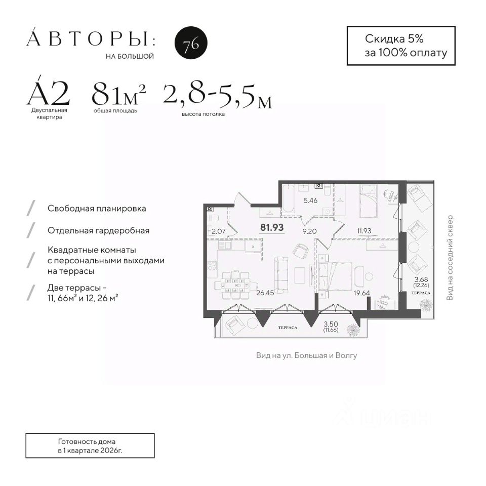 Продается 2-к квартира 22 в клубном доме "Авторы на Большой 76". Видовая квартира с терассой и двумя спальнями на 6 этаже площадью 81.93 м², кухней-гостинной площадью 26.45 м², высотой потолков от 2,8 до 4,5 м и двумя санузлами. Окна выходят на две стороны и открывают вид на Волгу. Квартира сдается в свободной планировке, предоставляя полную свободу для ваших предпочтений в дизайне и возможность подстроить пространство под ваши жизненные ценности.