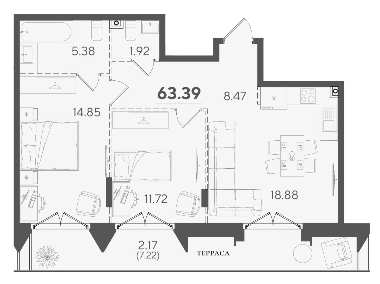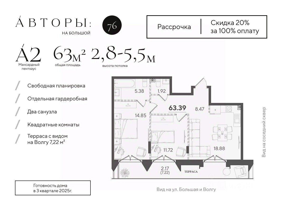 Продается 2-к квартира 23 в клубном доме "Авторы на Большой 76". Видовая квартира с терассой и двумя спальнями на 6 этаже площадью 63.39 м², кухней-гостинной площадью 18.88 м², высотой потолков от 2,8 до 4,5 м и двумя санузлами. Окна открывают вид на Волгу. Квартира сдается в свободной планировке, предоставляя полную свободу для ваших предпочтений в дизайне и возможность подстроить пространство под ваши жизненные ценности.
