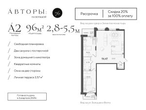 Продается 2-к квартира 24 в клубном доме "Авторы на Большой 76". Видовая квартира с терассой и двумя спальнями на 6 этаже площадью 96.47 м², кухней-гостинной площадью 37.53 м², высотой потолков от 2,8 до 4,5 м и двумя санузлами. Окна выходят на две стороны и открывают вид на Волгу и дзен-двор с обильным озеленением. Квартира сдается в свободной планировке, предоставляя полную свободу для ваших предпочтений в дизайне и возможность подстроить пространство под ваши жизненные ценности.