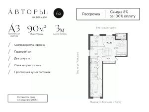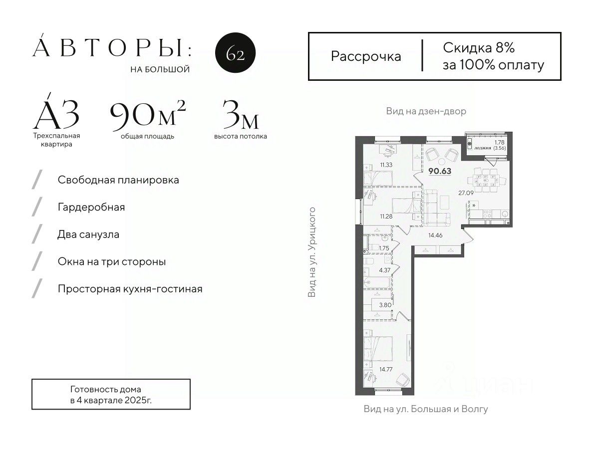 Продается 3-к квартира 5 в клубном доме "Авторы на Большой 62". Квартира с тремя спальнями на 2 этаже площадью 90.63 м², кухней-гостинной площадью 27.09 м², высотой потолков 3 м и двумя санузлами. Окна выходят на две стороны и открывают вид на дзен-двор с обильным озеленением и ул. Урицкого. Квартира сдается в свободной планировке, предоставляя полную свободу для ваших предпочтений в дизайне и возможность подстроить пространство под ваши жизненные ценности.