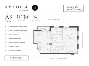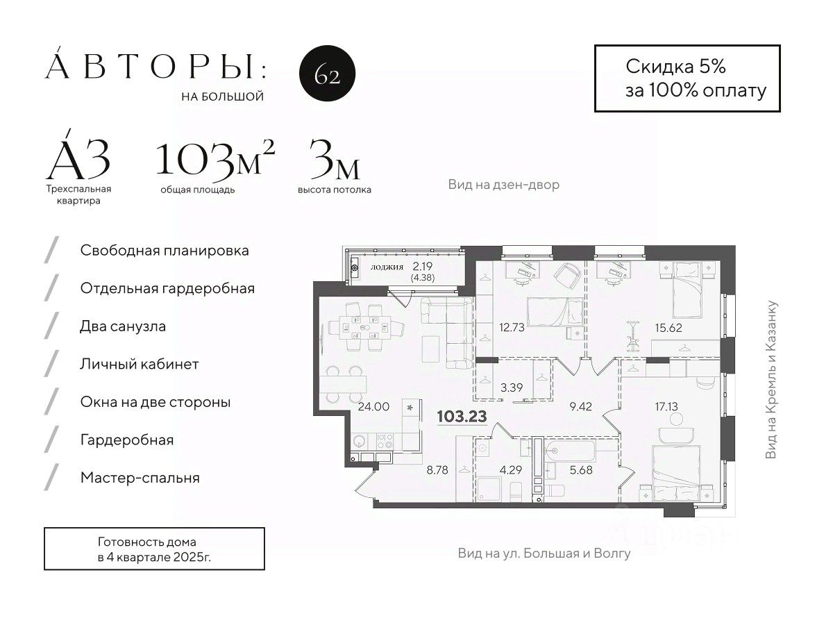 Продается 3-к квартира 6 в клубном доме "Авторы на Большой 62". Квартира с тремя спальнями на 3 этаже площадью 103.23 м², кухней-гостинной площадью 24 м², высотой потолков 3 м и двумя санузлами. Окна выходят на две стороны и открывают вид на Казанский Кремль, Волгу и дзен-двор с обильным озеленением. Квартира сдается в свободной планировке, предоставляя полную свободу для ваших предпочтений в дизайне и возможность подстроить пространство под ваши жизненные ценности.