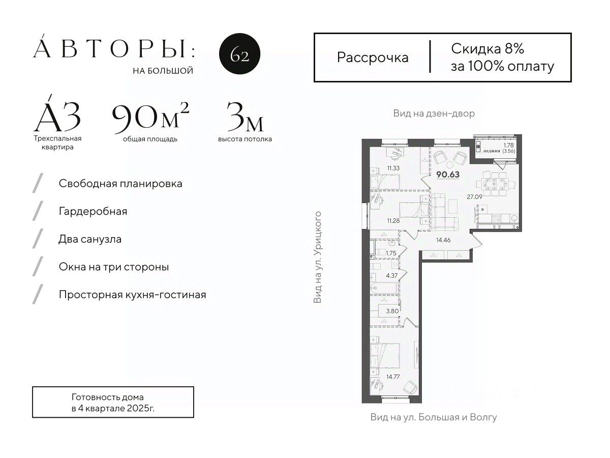 Продается 3-к квартира 10 в клубном доме "Авторы на Большой 62". Квартира с тремя спальнями на 3 этаже площадью 90.63 м², кухней-гостинной площадью 27.09 м², высотой потолков 3 м и двумя санузлами. Окна выходят на две стороны и открывают вид на дзен-двор с обильным озеленением и ул. Урицкого. Квартира сдается в свободной планировке, предоставляя полную свободу для ваших предпочтений в дизайне и возможность подстроить пространство под ваши жизненные ценности.