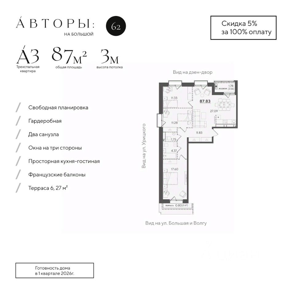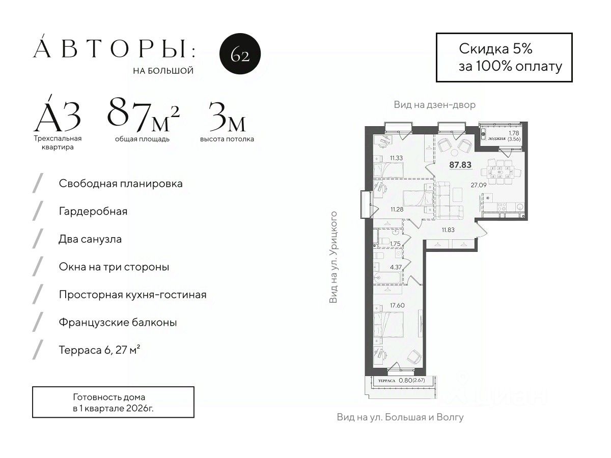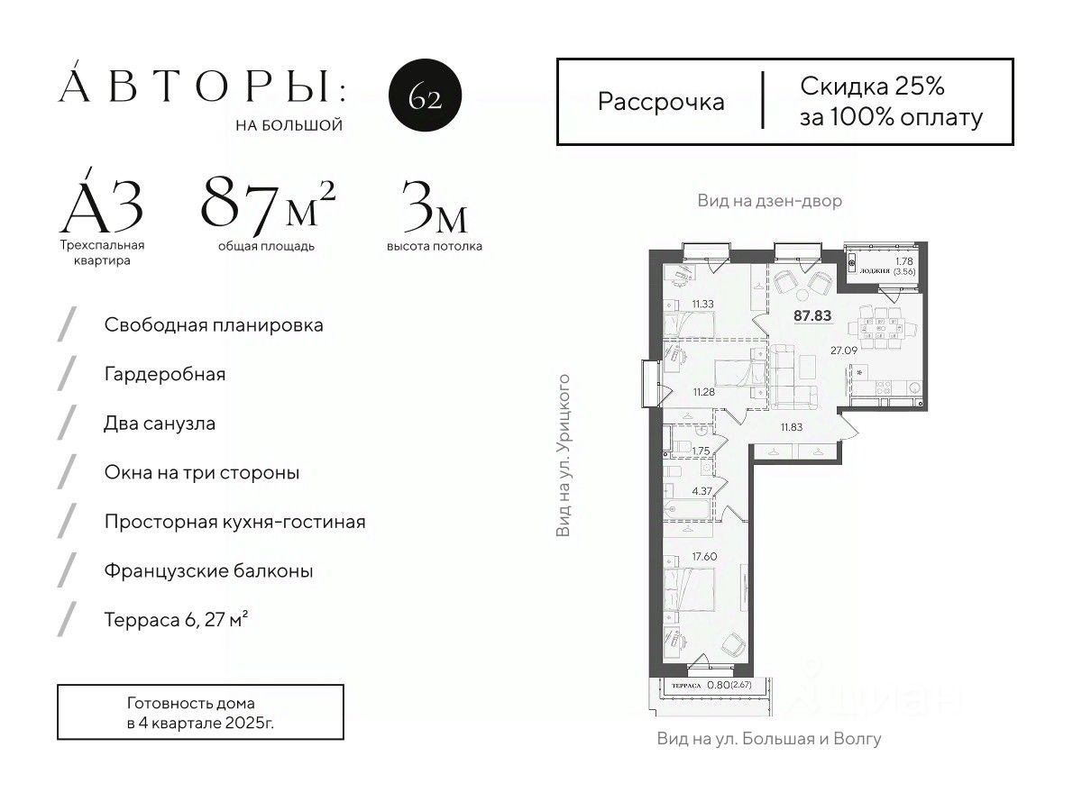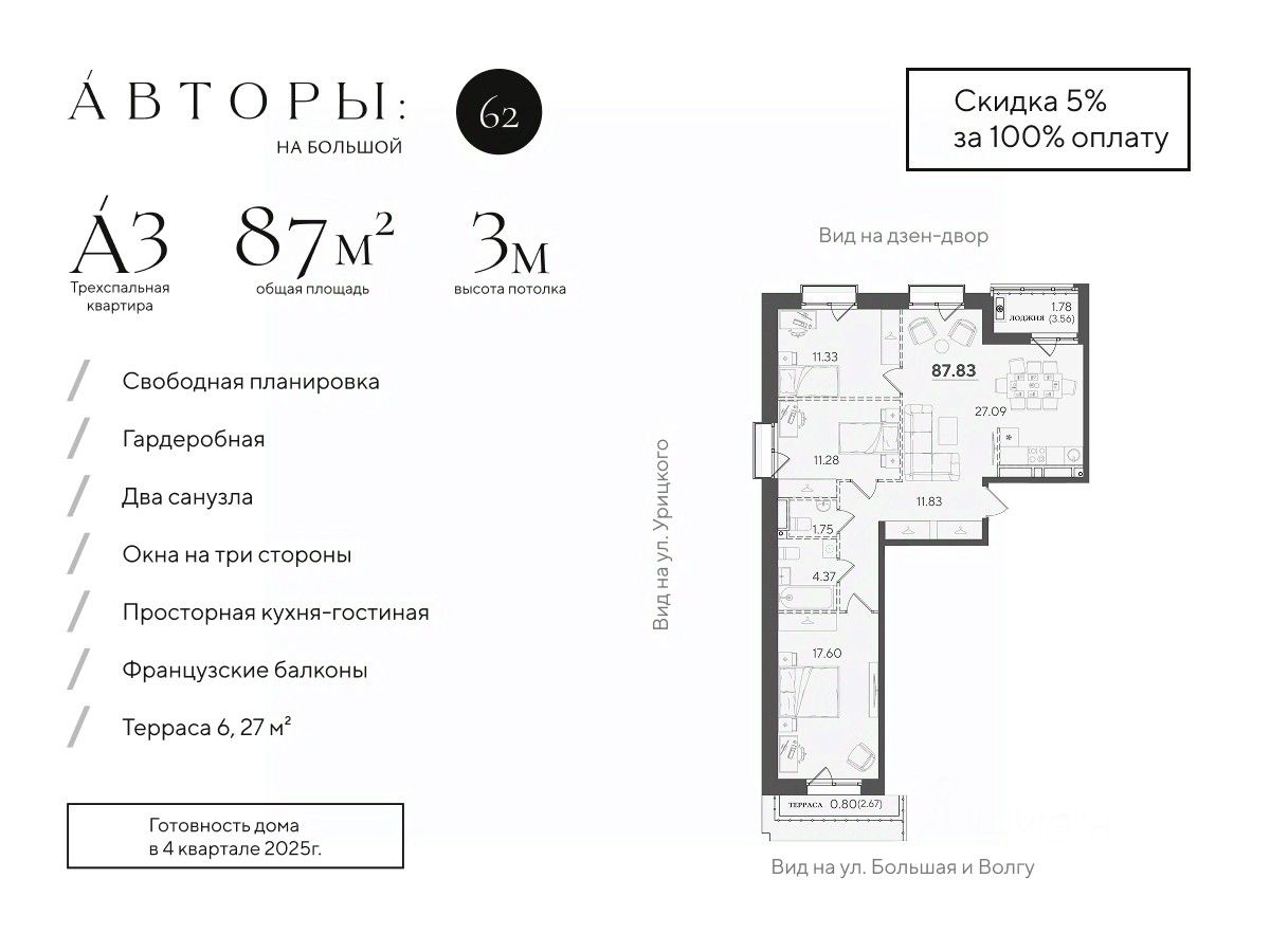 Продается видовая 3-к квартира 25 в клубном доме "Авторы на Большой 62". Квартира с тремя спальнями на 6 этаже площадью 87.83 м², кухней-гостинной площадью 27.09 м², высотой потолков 3 м и двумя санузлами. Окна выходят на две стороны и открывают вид на дзен-двор с обильным озеленением и ул. Урицкого. Квартира сдается в свободной планировке, предоставляя полную свободу для ваших предпочтений в дизайне и возможность подстроить пространство под ваши жизненные ценности.