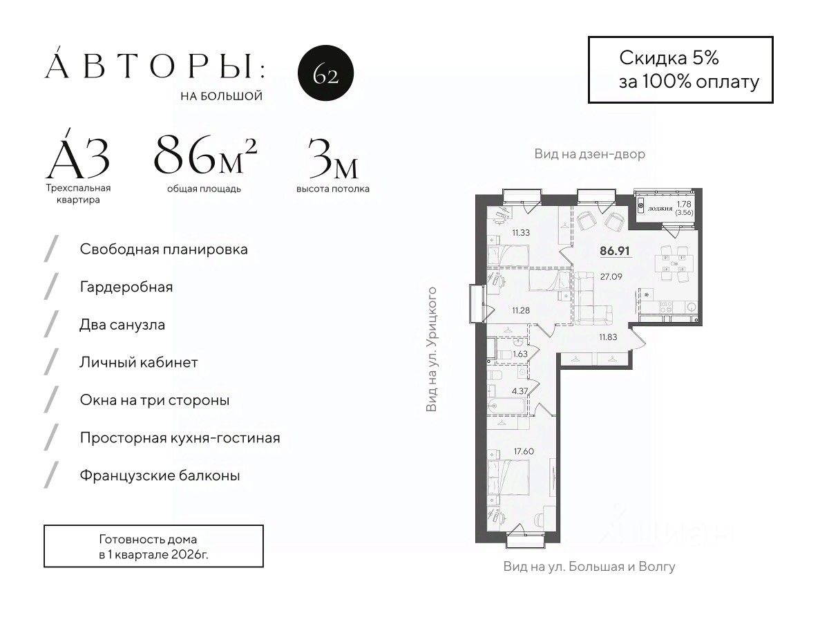Продается 3-к квартира 27 в клубном доме "Авторы на Большой 62". Квартира с тремя спальнями на 7 этаже площадью 86.91 м², кухней-гостинной площадью 27.09 м², высотой потолков 3 м и двумя санузлами. Окна выходят на три стороны и открывают вид на Волгу, дзен-двор с обильным озеленением и ул. Урицкого. Квартира сдается в свободной планировке, предоставляя полную свободу для ваших предпочтений в дизайне и возможность подстроить пространство под ваши жизненные ценности.
