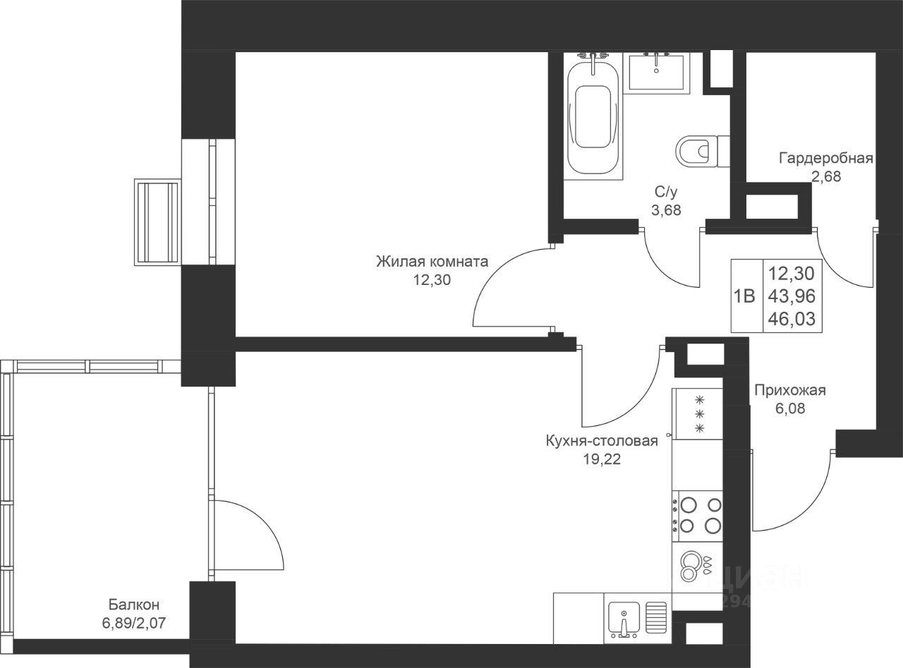 Просторная 1-комнатная квартира с кухней-гостиной, из которой организован выход на балкон. Здесь можно устраивать семейные ужины или встречи с друзьями.