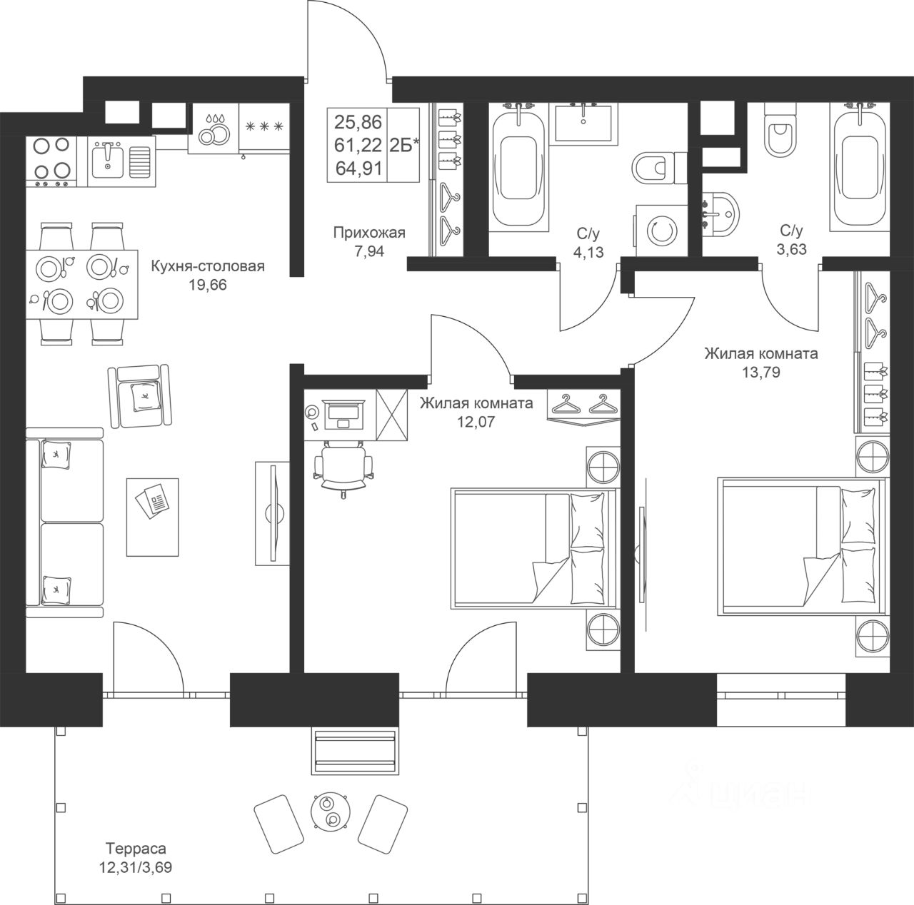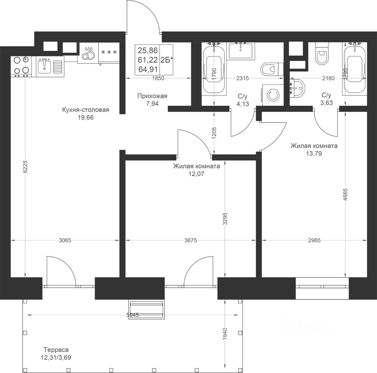 Продается 2 ЕВРО-комнатная квартира 99 площадью 64,91 кв.м на 1 этаже в строящемся доме проекта "Новый свет" компании "Ак Барс Дом".