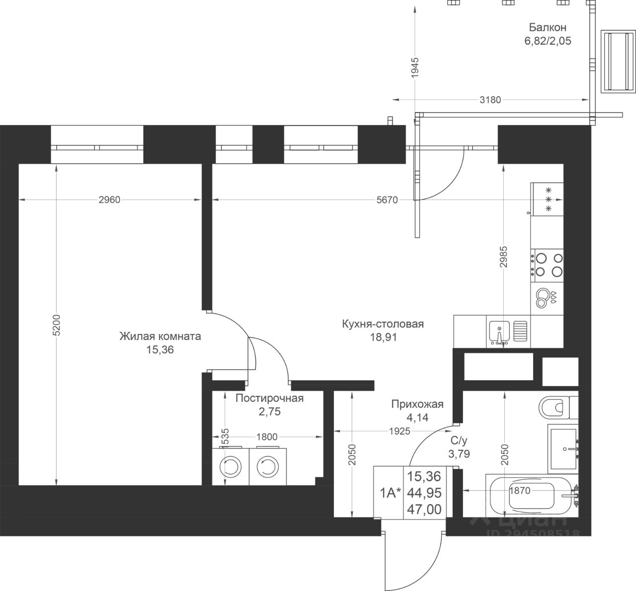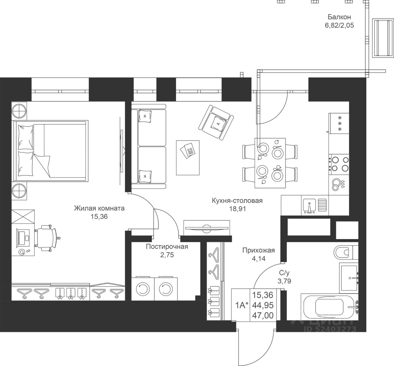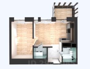Просторная 1-комнатная квартира с кухней-гостиной, из которой организован выход на балкон. Здесь можно устраивать семейные ужины или встречи с друзьями.