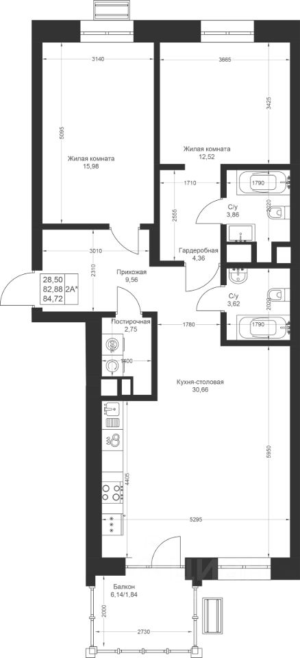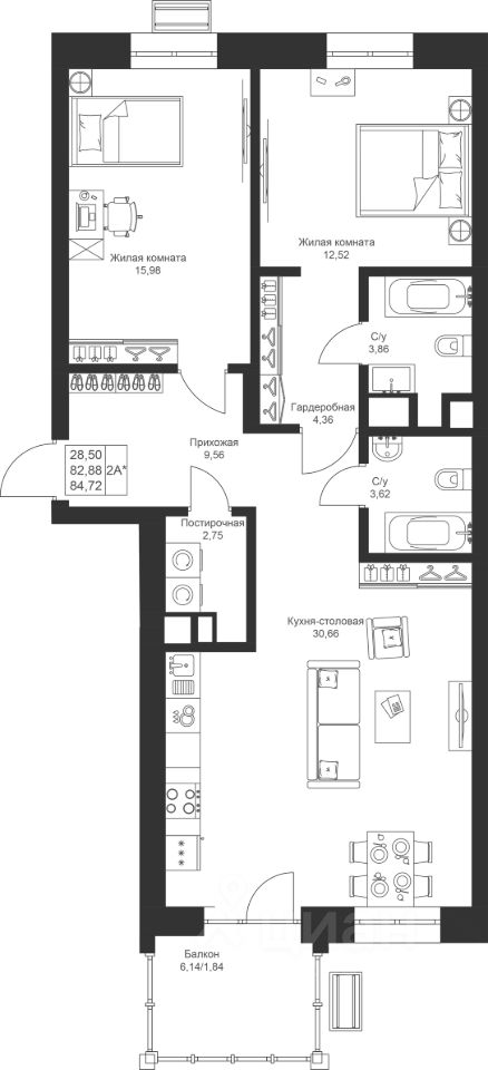 Уютная 2-комнатная квартира с кухней-гостиной и отдельной спальней. На балконе можно обустроить дополнительное место для отдыха или работы. Продуманное зонирование: кухонная зона находится в нише, чтобы скрыть рабочие процессы.