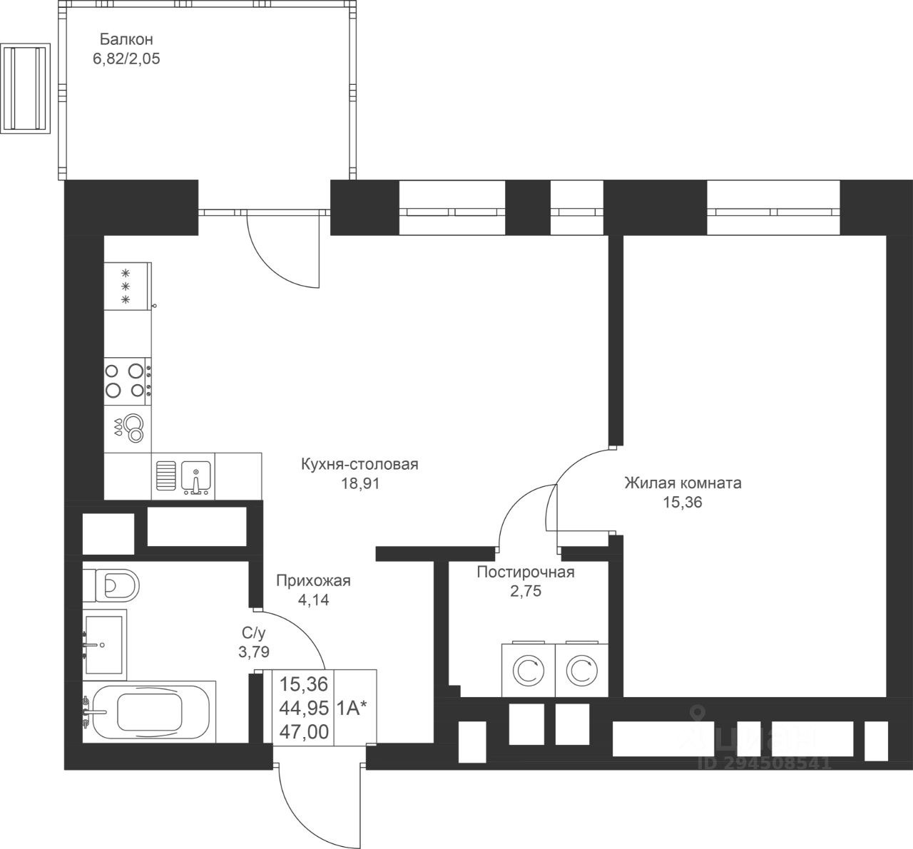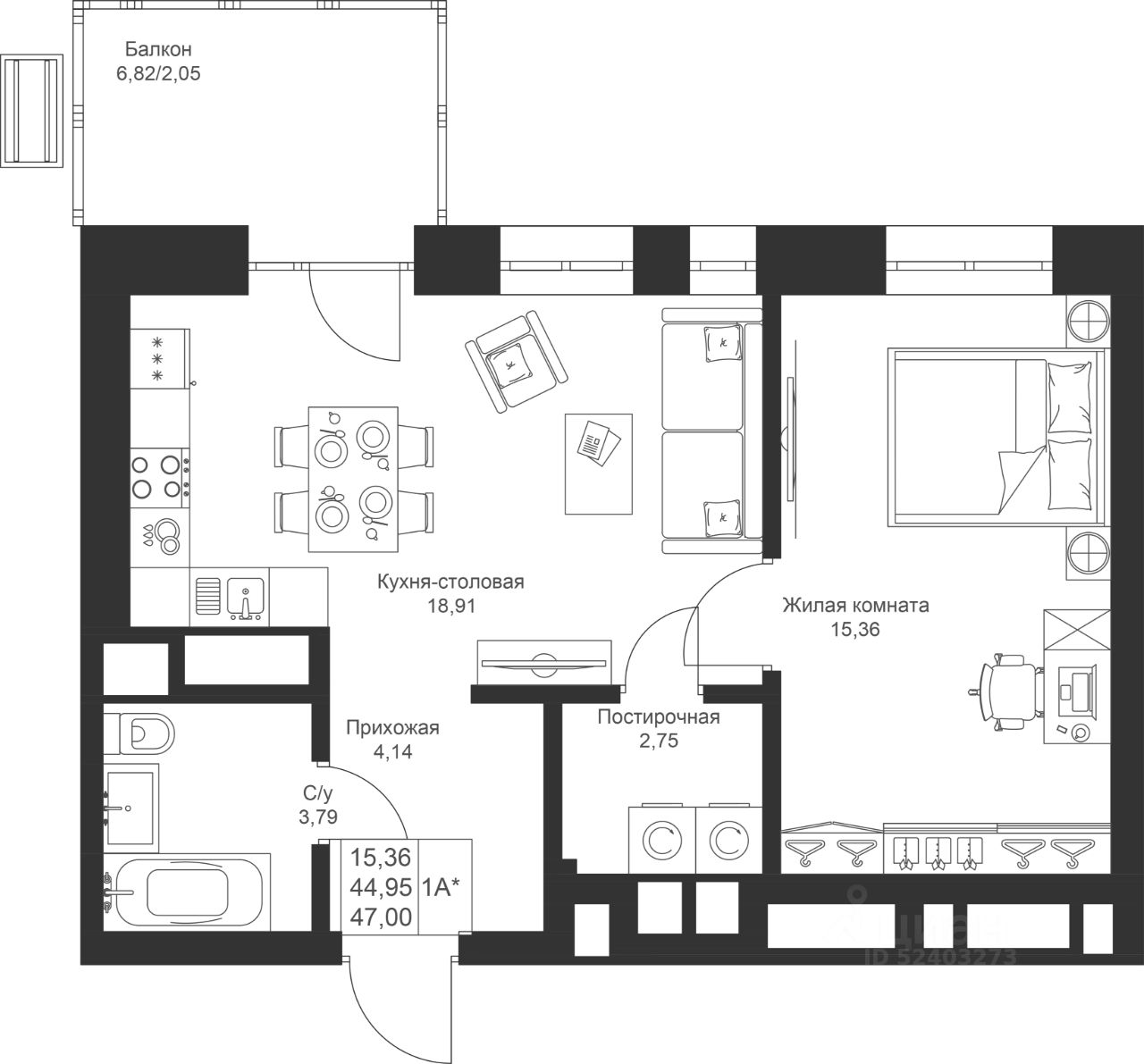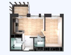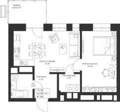 Просторная 1-комнатная квартира с кухней-гостиной, из которой организован выход на балкон. Здесь можно устраивать семейные ужины или встречи с друзьями.
