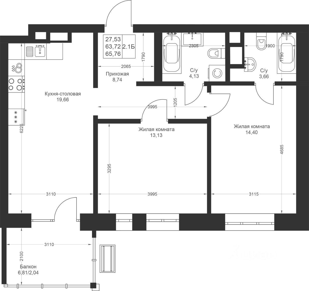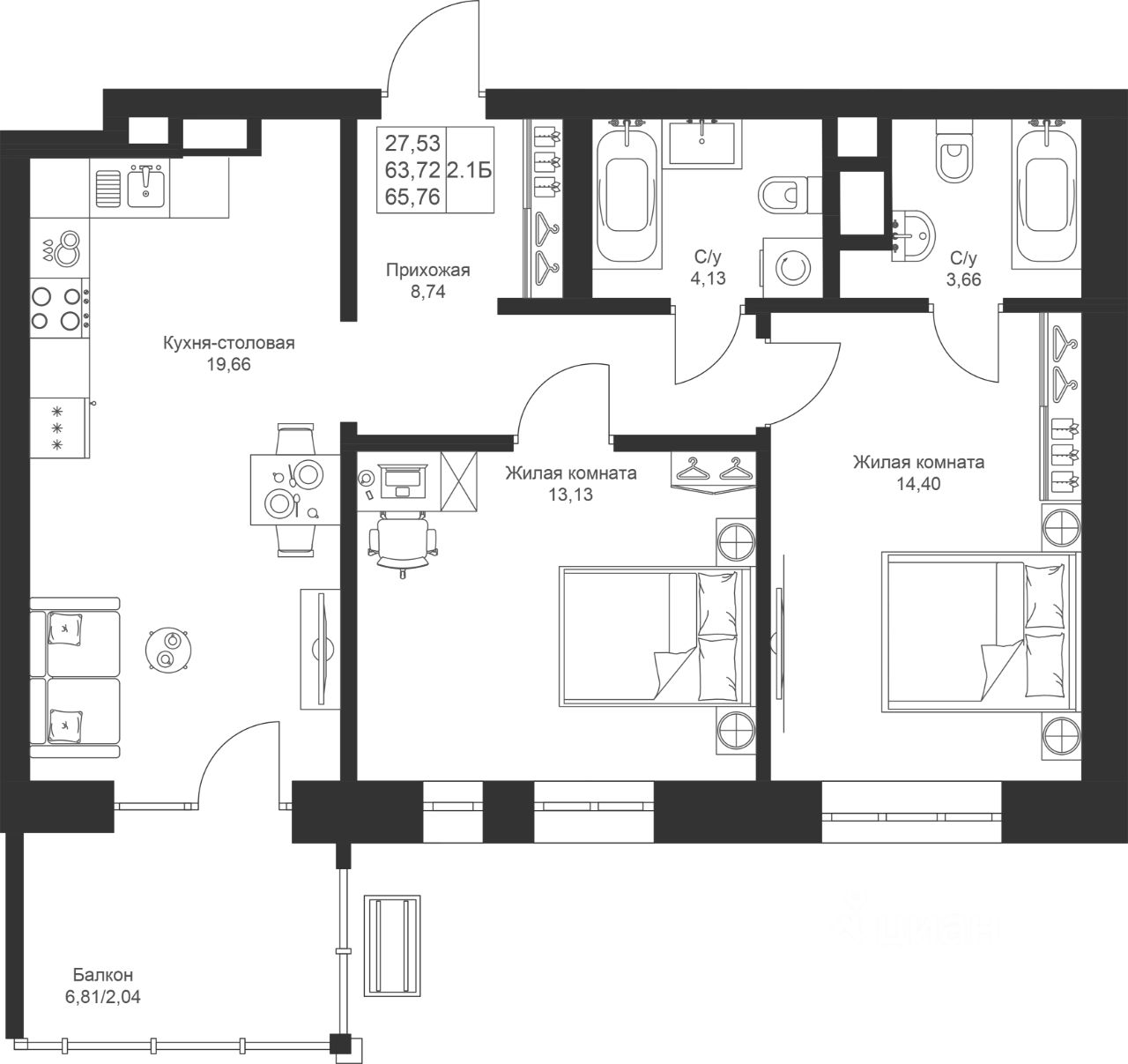 Продается 2 ЕВРО-комнатная квартира 135 площадью 65,76 кв.м на 4 этаже в строящемся доме проекта "Новый свет" компании "Ак Барс Дом".