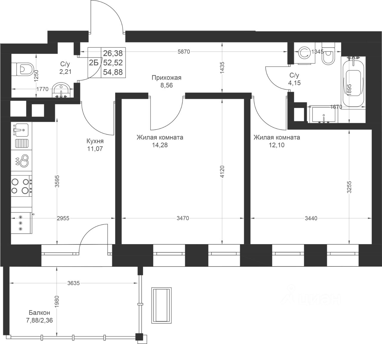 Продается 2-комнатная квартира 143 площадью 54,88 кв.м на 2 этаже в строящемся доме проекта "Новый свет" компании "Ак Барс Дом".