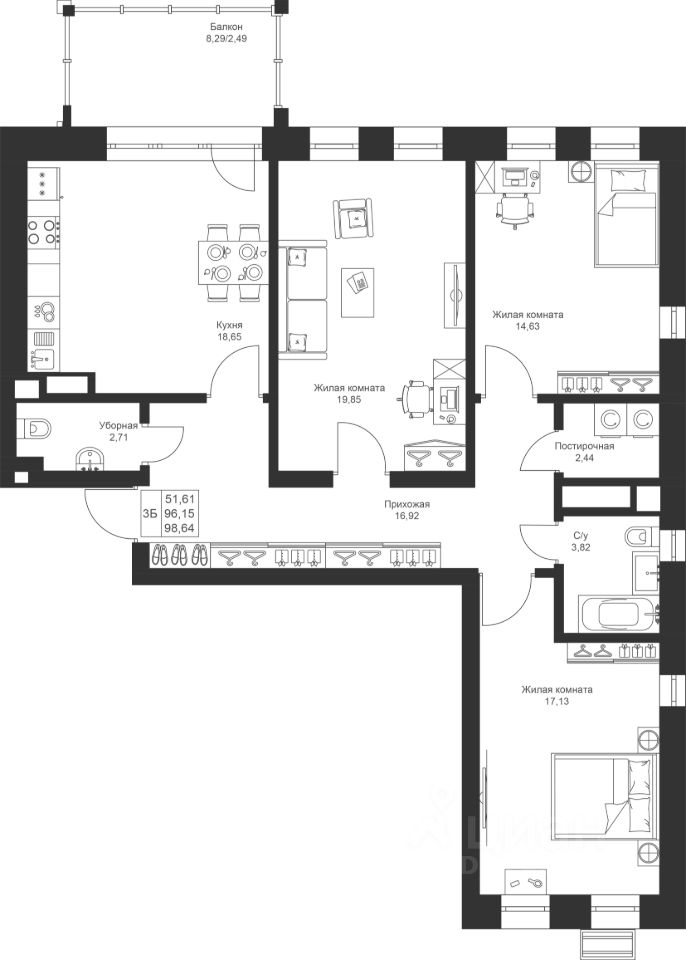 Продается 3-комнатная квартира 146 площадью 98,64 кв.м на 3 этаже в строящемся доме проекта "Новый свет" компании "Ак Барс Дом".