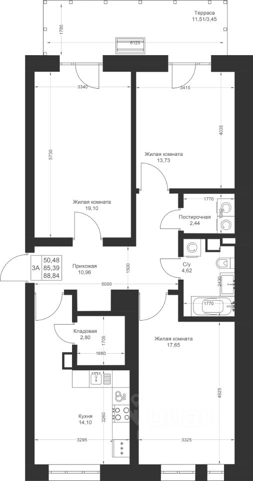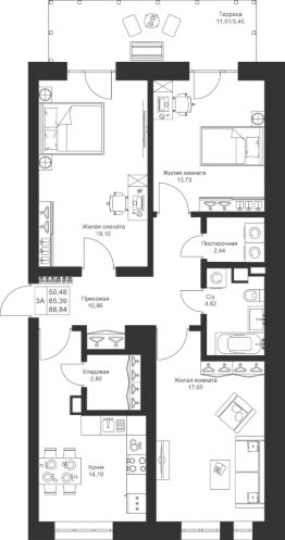 Продается 3-комнатная квартира 154 площадью 88,84 кв.м на 1 этаже в строящемся доме проекта "Новый свет" компании "Ак Барс Дом".