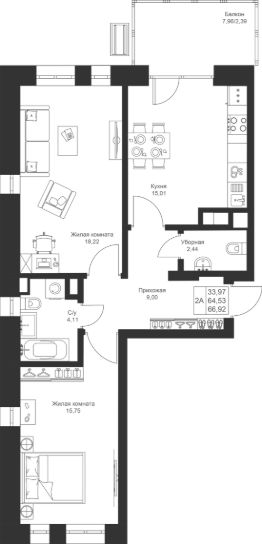 Продается 2-комнатная квартира 179 площадью 66,92 кв.м на 3 этаже в строящемся доме проекта "Новый свет" компании "Ак Барс Дом".