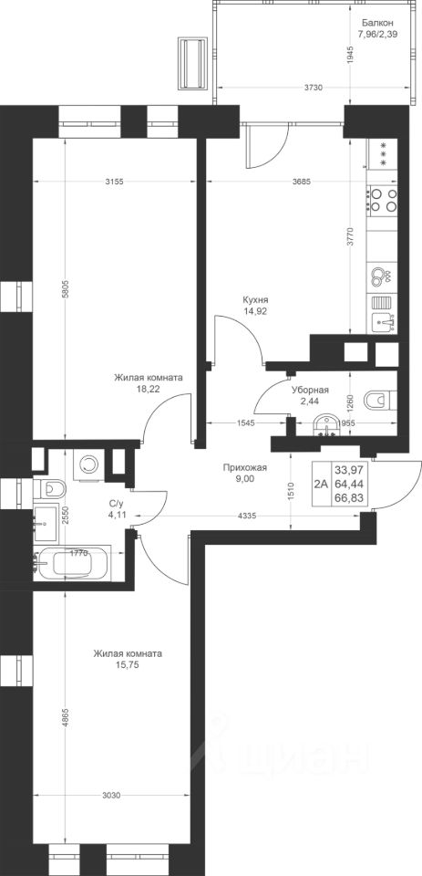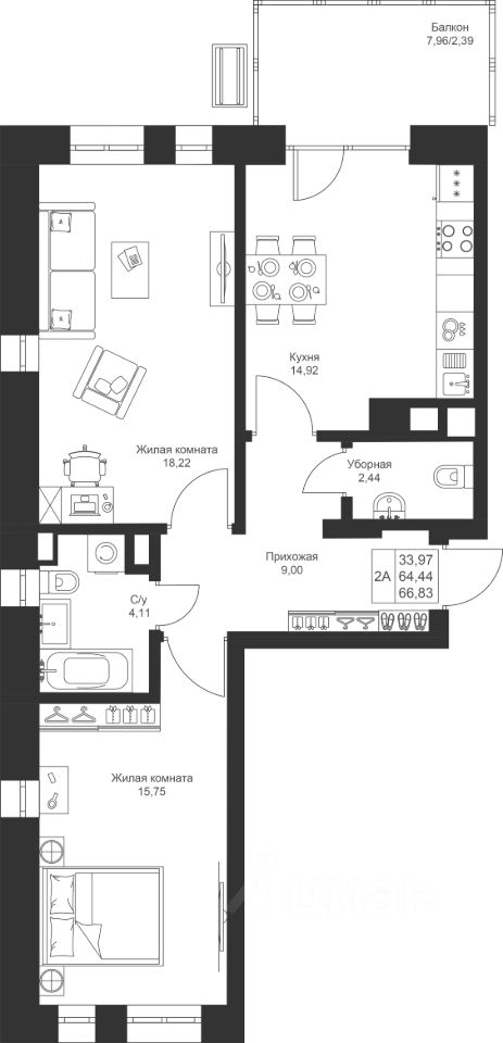 Продается 2-комнатная квартира 183 площадью 66,83 кв.м на 4 этаже в строящемся доме проекта "Новый свет" компании "Ак Барс Дом".