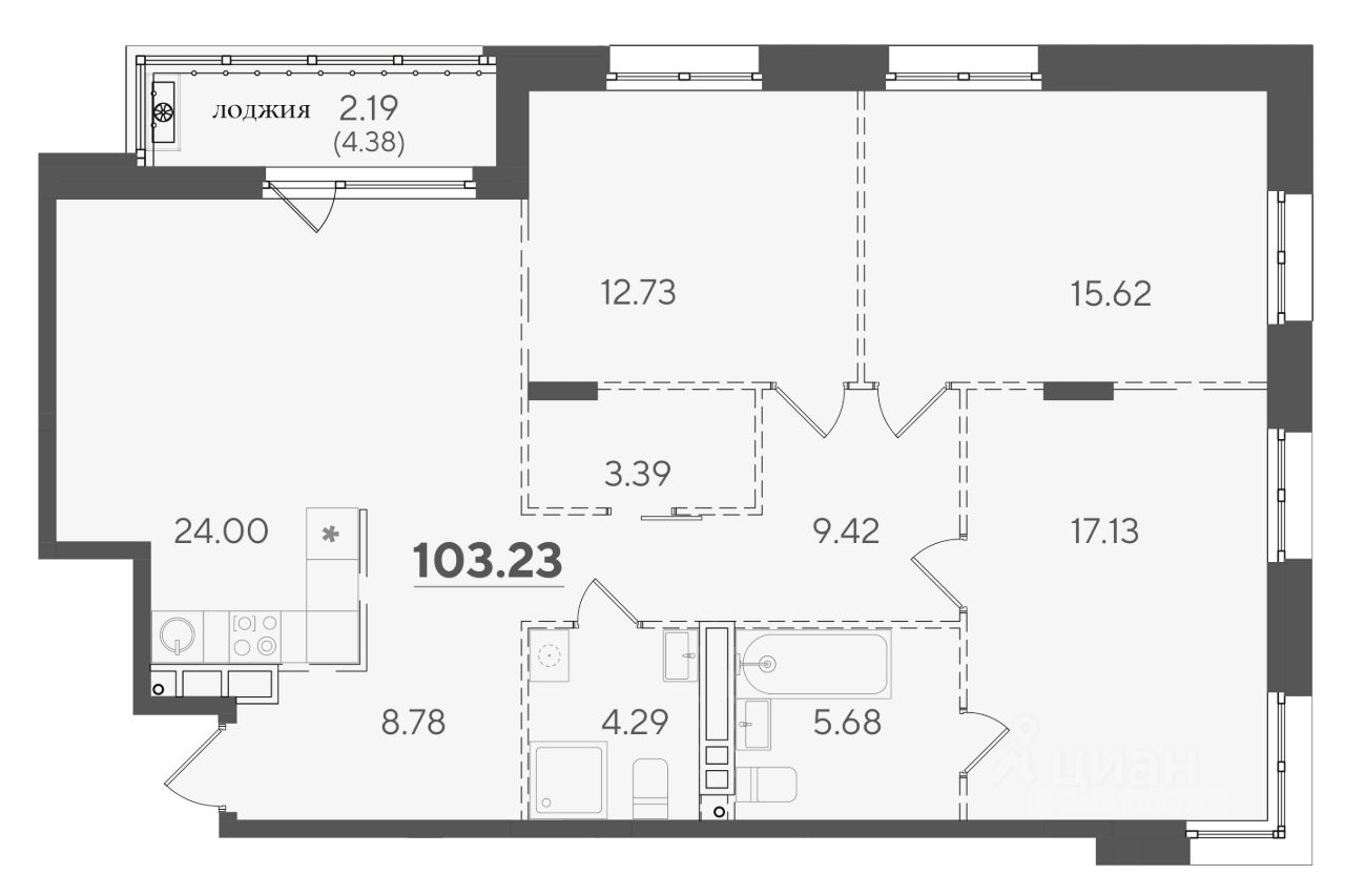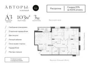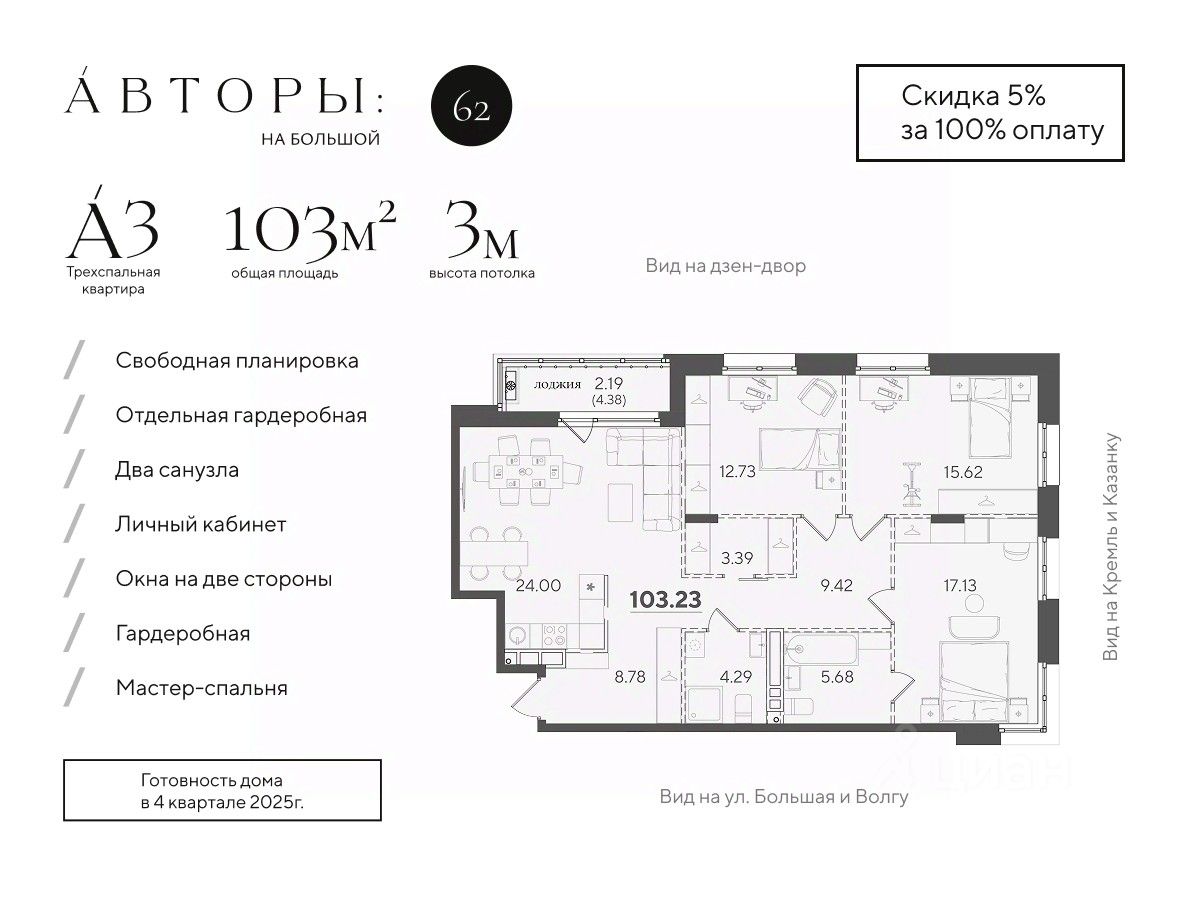 Продается видовая 3-к квартира 11 в клубном доме "Авторы на Большой 62". Квартира с тремя спальнями на 4 этаже площадью 103.23 м², кухней-гостинной площадью 24 м², высотой потолков 3 м и двумя санузлами. Окна выходят на две стороны и открывают вид на Казанский Кремль, Волгу и дзен-двор с обильным озеленением. Квартира сдается в свободной планировке, предоставляя полную свободу для ваших предпочтений в дизайне и возможность подстроить пространство под ваши жизненные ценности.