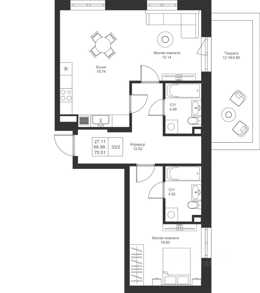 Продается 2-комнатная квартира 33 площадью 70,51 кв.м на 1 этаже в строящемся доме проекта "Новый свет" компании "Ак Барс Дом".