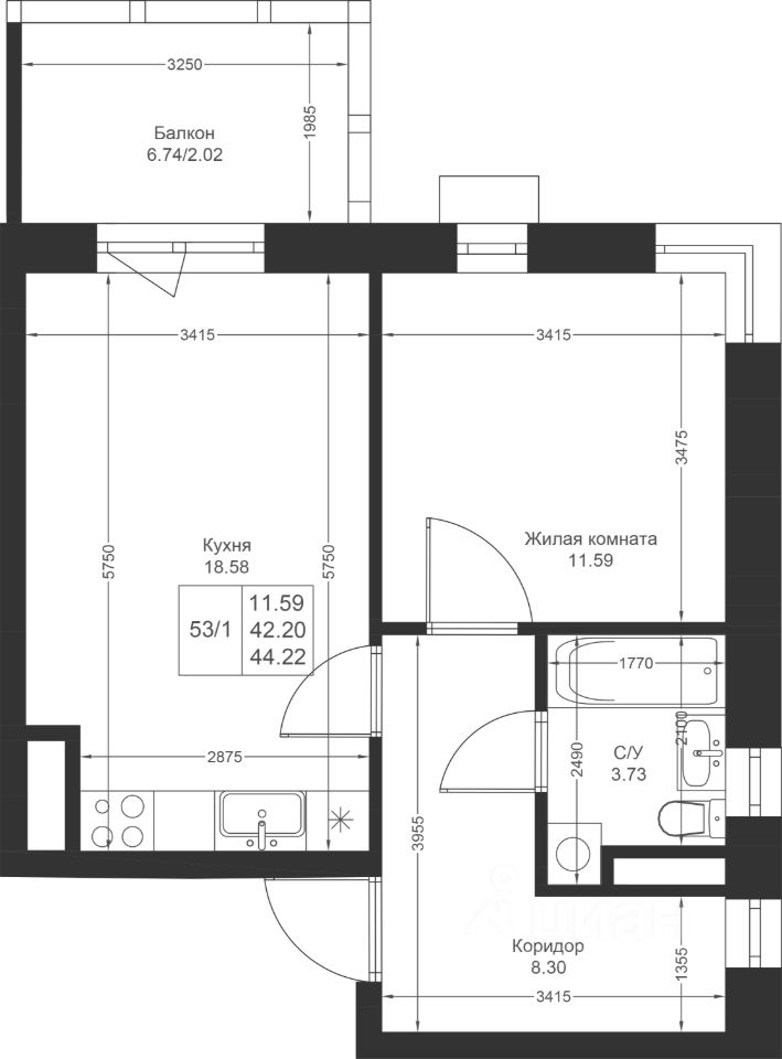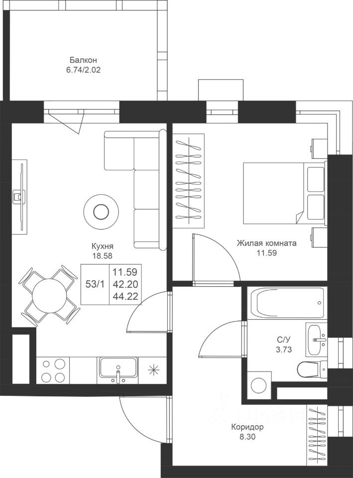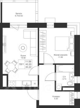 Продается 1-комнатная квартира 53 площадью 44,22 кв.м на 4 этаже в строящемся доме проекта "Новый свет" компании "Ак Барс Дом".
