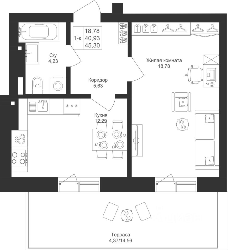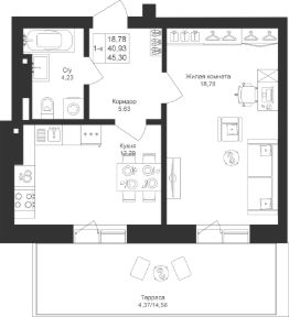 Продается 1-комнатная квартира 71 площадью 45,3 кв.м на 1 этаже в строящемся доме проекта "Новый свет" компании "Ак Барс Дом".