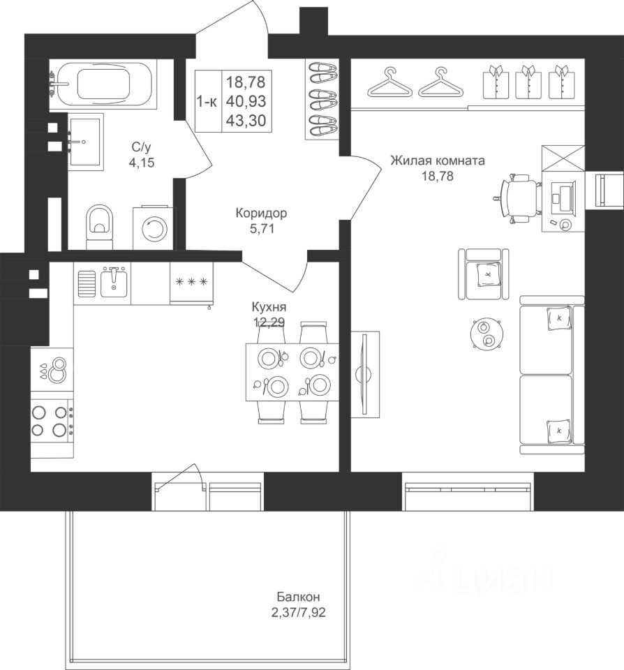 Площадь комнаты позволяет зонировать ее на спальную и гостевую зоны. В проекте функциональная прихожая, чтобы вам было удобно хранить свои вещи.