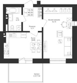 Продается 1-комнатная квартира 81 площадью 43,3 кв.м на 3 этаже в строящемся доме проекта "Новый свет" компании "Ак Барс Дом".