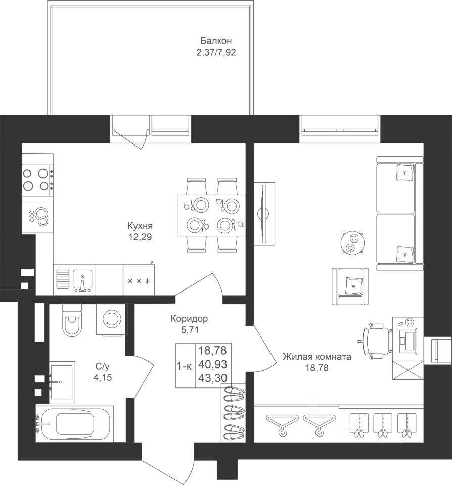 Продается 1-комнатная квартира 90 площадью 43,3 кв.м на 2 этаже в строящемся доме проекта "Новый свет" компании "Ак Барс Дом".