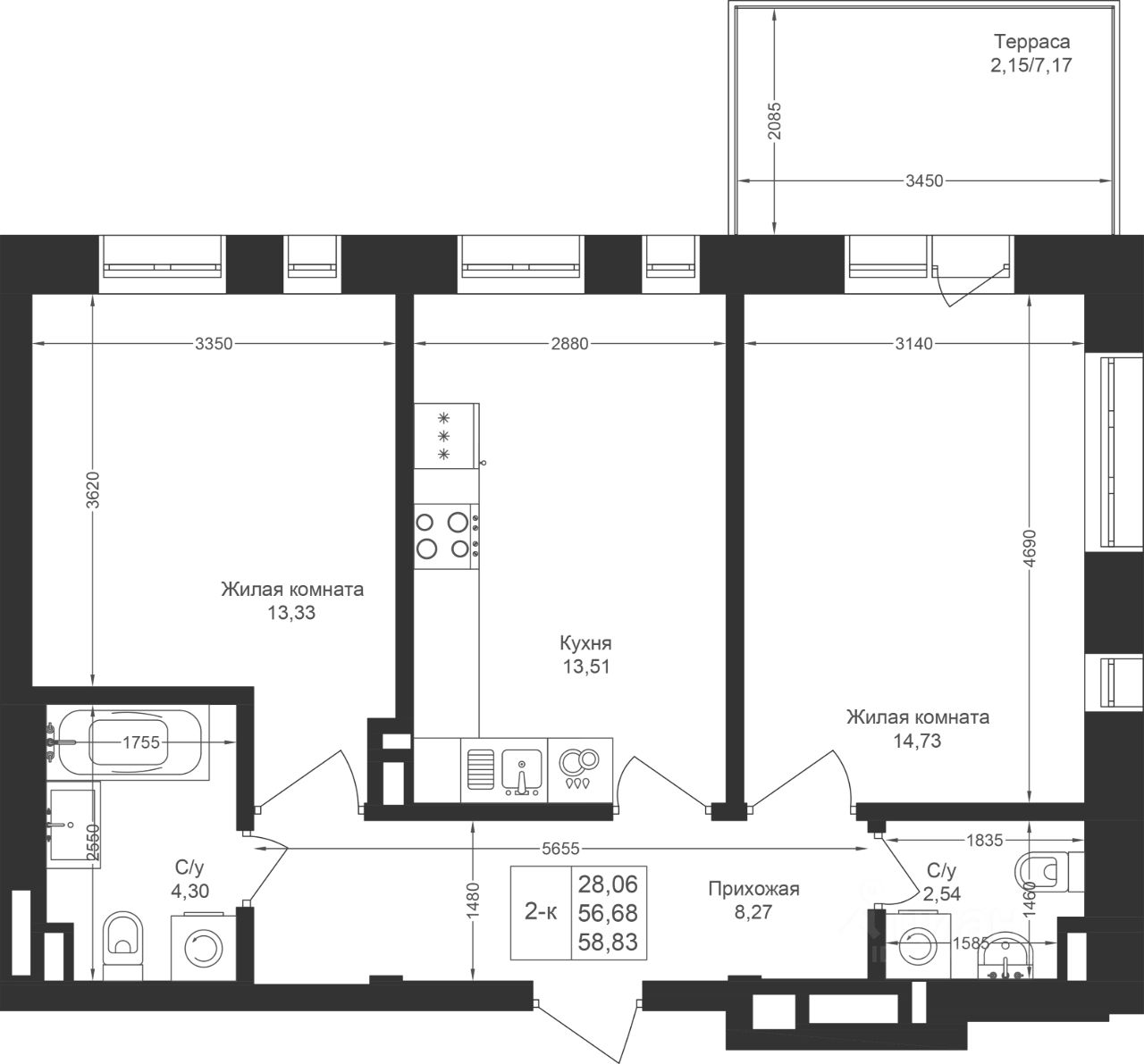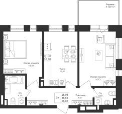 Продается 2-комнатная квартира 127 площадью 58,83 кв.м на 1 этаже в строящемся доме проекта "Новый свет" компании "Ак Барс Дом".