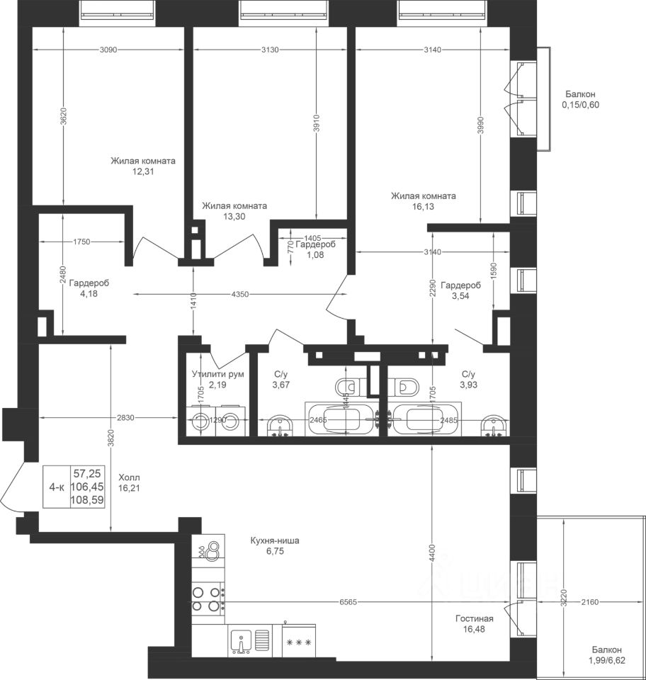 Окна в квартире выходят на обе стороны дома, благодаря чему в помещениях будет больше света и воздуха. 3 санузла, прачечная и отдельная гардеробная функциональное решение для большой семьи.