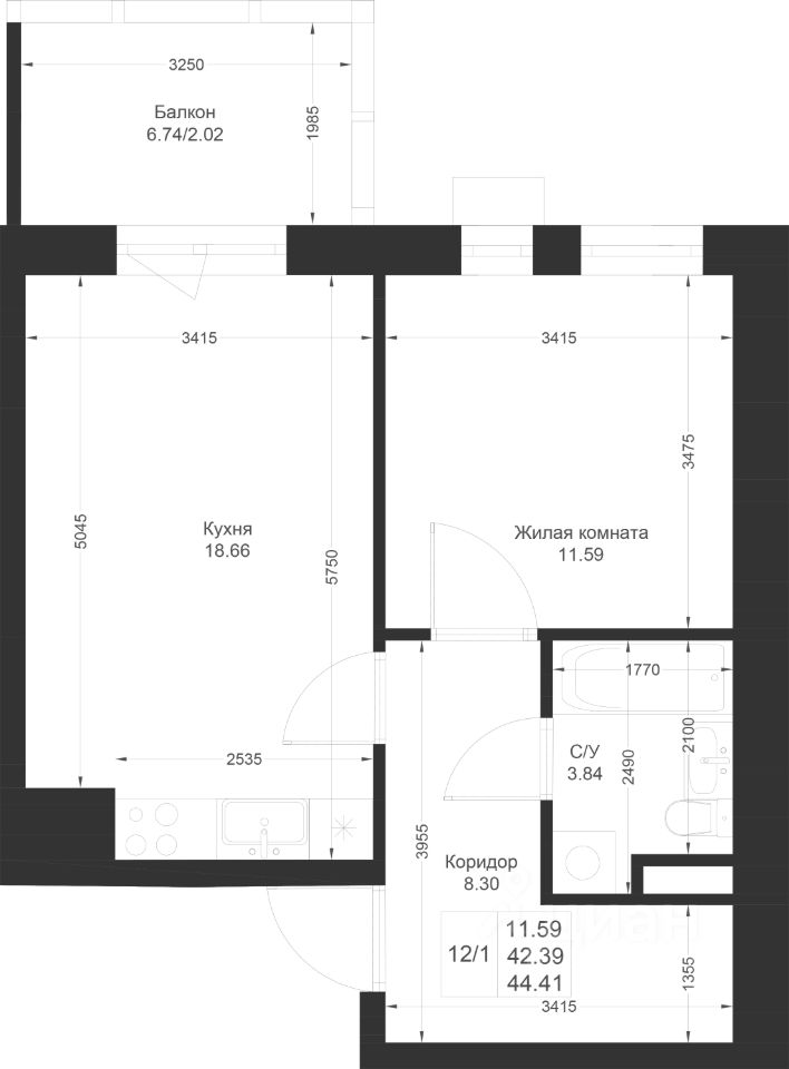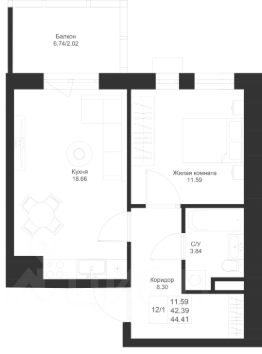 Продается 1-комнатная квартира 12 площадью 44,41 кв.м на 2 этаже в строящемся доме проекта "Новый свет" компании "Ак Барс Дом".
